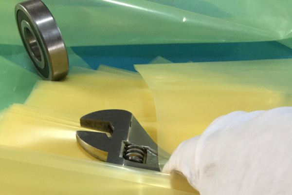 VCI氣相防銹膜(防銹袋)是將高分子聚乙烯樹脂(LDPE)與功能VCI樹脂配比混合,采用現(xiàn)代薄膜共擠技術生產(chǎn)的新一代復合防銹薄膜。具有良好的氣化防銹性能、阻隔防潮、使用方便、透明直觀等特點;當用塑料袋包裹金屬產(chǎn)品時,氣相緩蝕劑在封閉空間內氣化并凝聚在所有金屬表面上形成氣相保護層,從而防止金屬產(chǎn)品銹蝕。符合GB-T19532-2004防銹性能要求。
